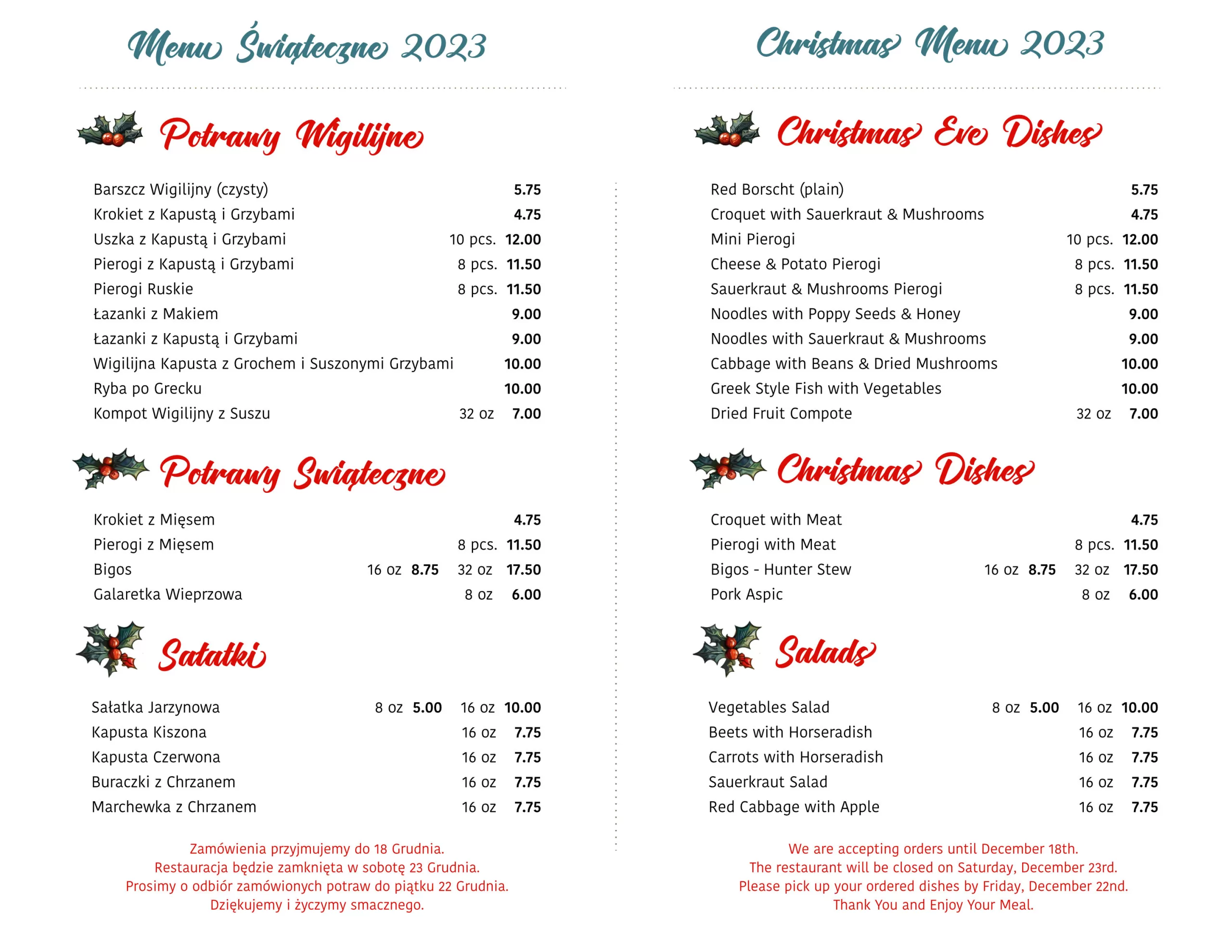 Welcome to the magical time of Christmas! We are proud to announce that Relax Restaurant is now offering traditional Polish Christmas dishes for Christmas Eve and Christmas Day.