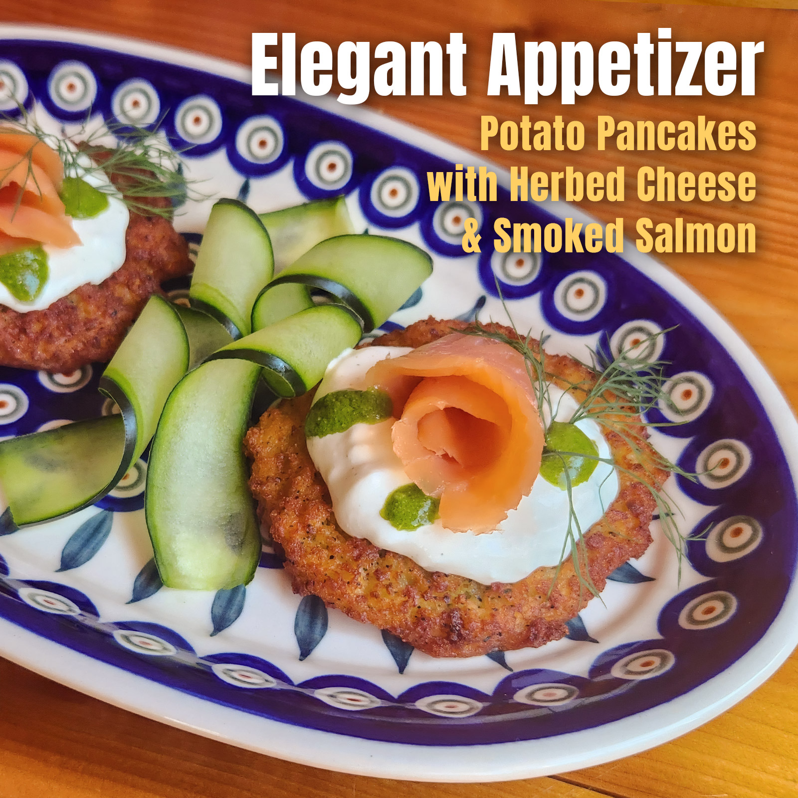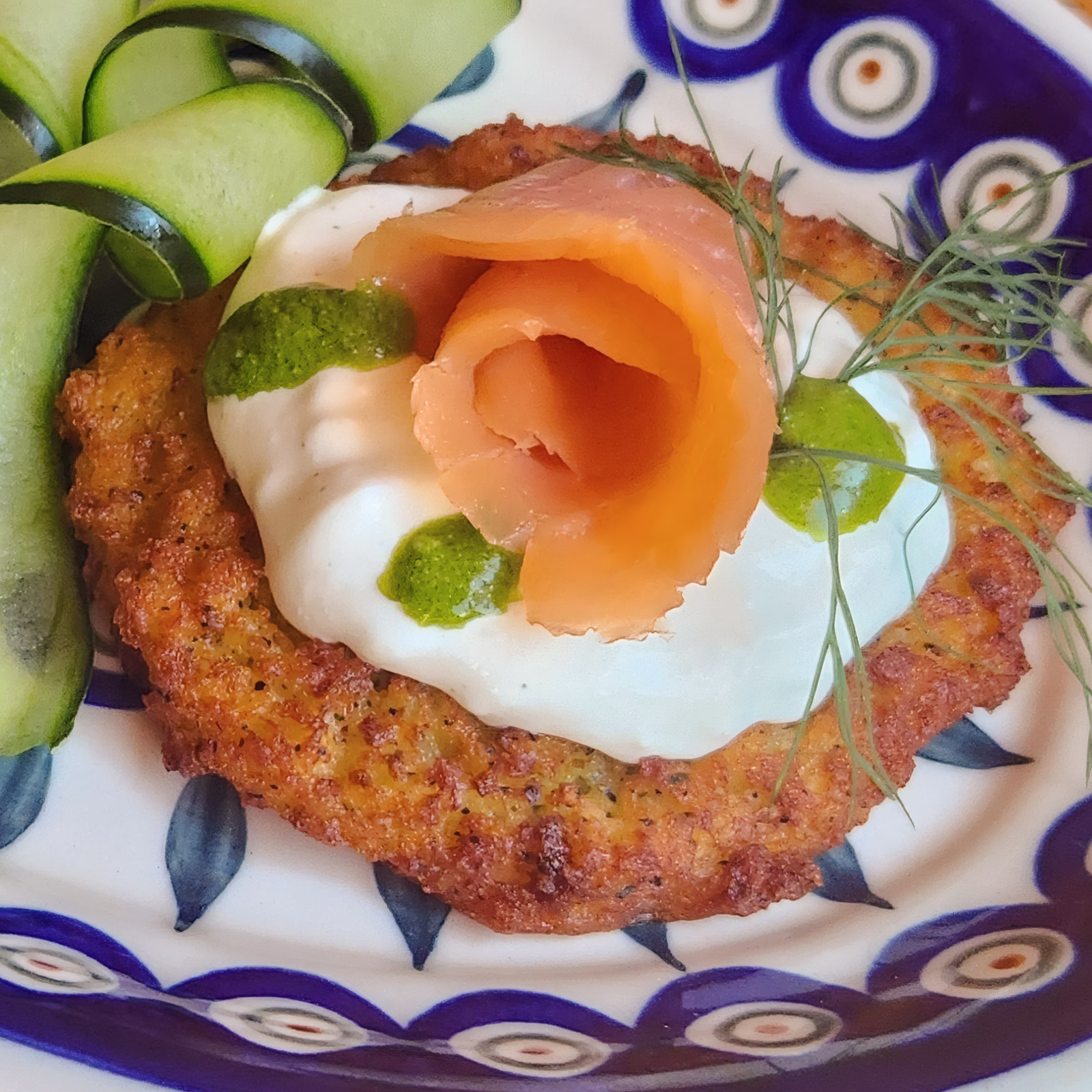 Experience the interplay of temperatures and textures: the comforting warmth of freshly made potato pancakes, the smooth richness of herbed cheese, and the delicate, cool touch of melt-in-your-mouth smoked salmon.